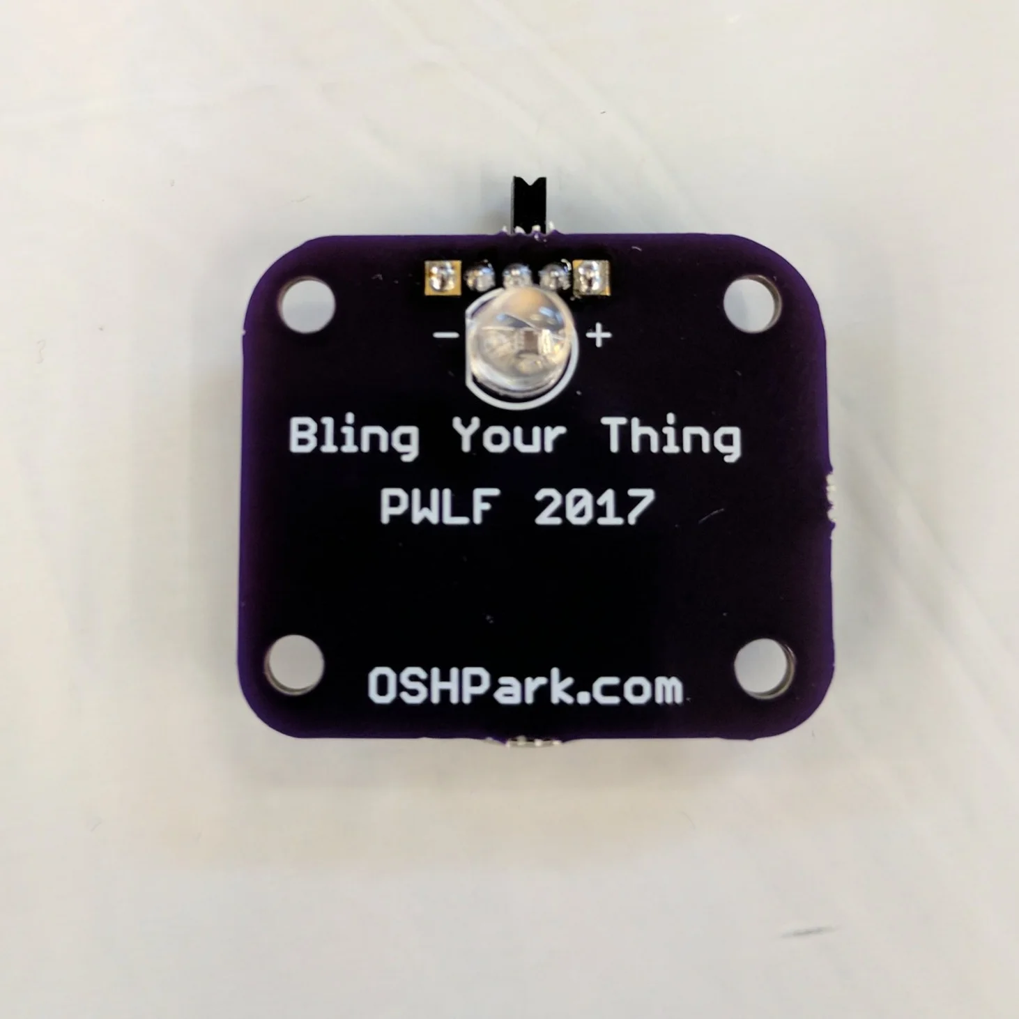 Solder the switch, LED and battery holder. The LED is inserted in the front side of the board, with the longer side of the LED inserted into the + side of the circle.
