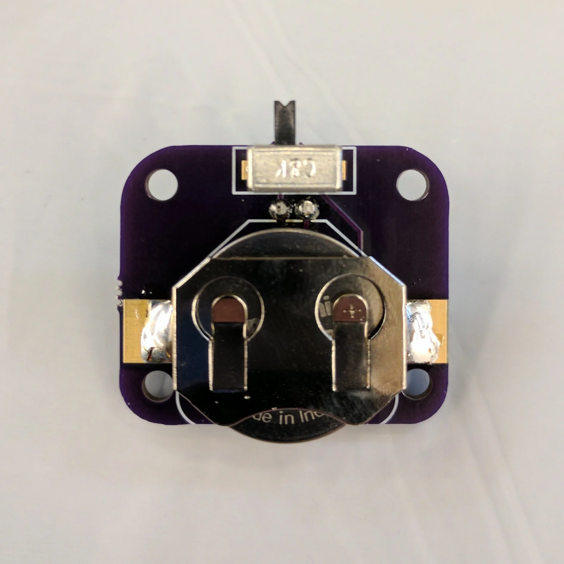 The switch and battery holder are attached to the back, matching the white outlines of the board.